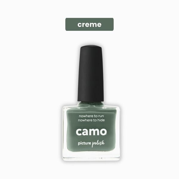 Camo er en khaki grøn creme neglelak uden effekter. Den kan også beskrives som en støvet grøn med neutral toning.