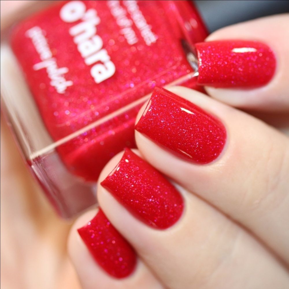 O'hara er en smuk rød neglelak med smuk scattered holografisk effekt i guld. Nuancen er feminin og lækker.